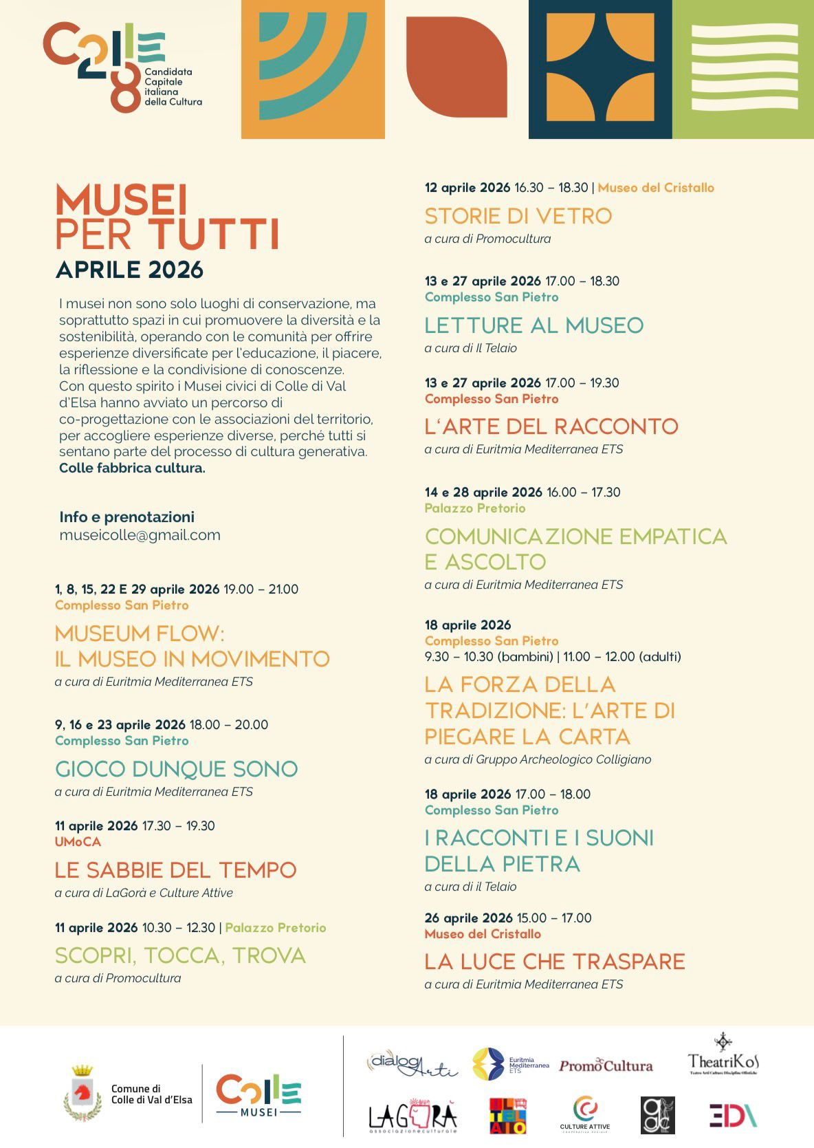Nel mese di aprile i musei di Colle di Val d’Elsa si trasformano in spazi dinamici e partecipati grazie al progetto “Musei per tutti”, promosso dai Musei civici colligiani e dal Comune. L’iniziativa propone un calendario ricco di attività rivolte a pubblici di tutte le età, con l’obiettivo di valorizzare i luoghi della cultura come ambienti aperti, inclusivi e capaci di favorire socialità e condivisione.